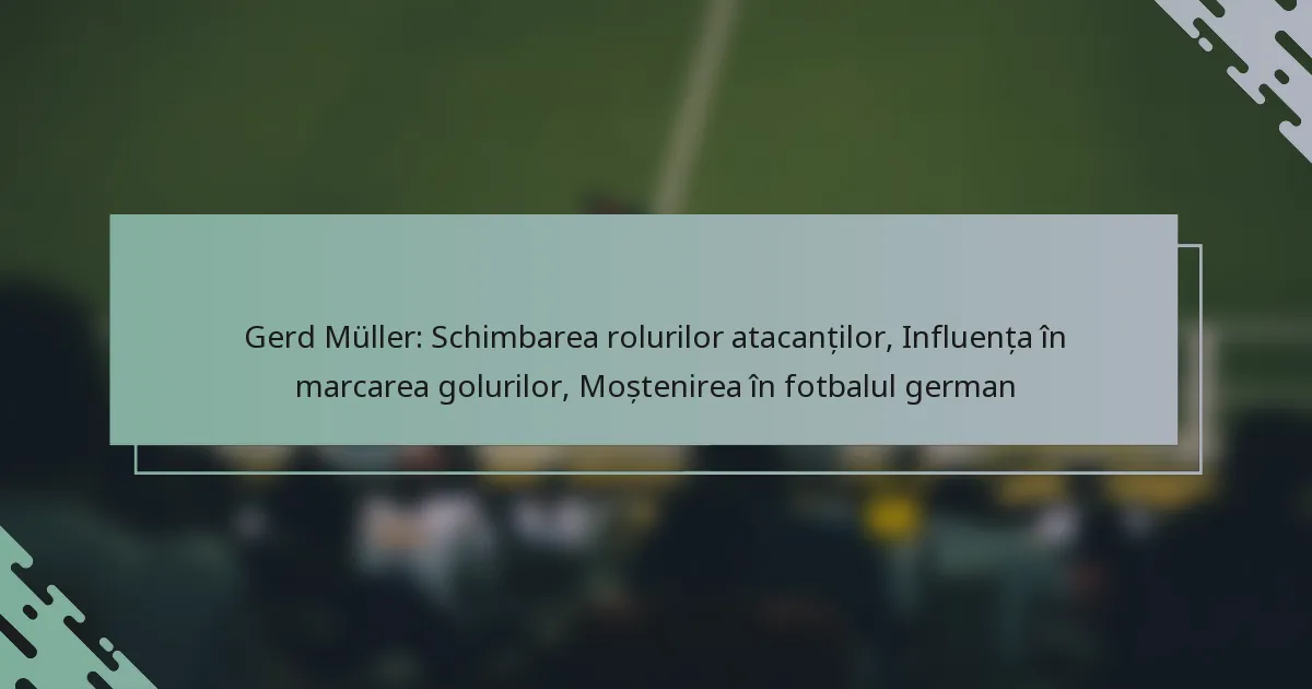 Moștenirea lui Gerd Müller în fotbalul german este definită de abilitatea sa extraordinară de a marca goluri, rolul său esențial în echipa națională și influența sa durabilă asupra sportului. A transformat poziția de atacant și a stabilit standarde în marcaj care rezonează în fotbalul de astăzi.